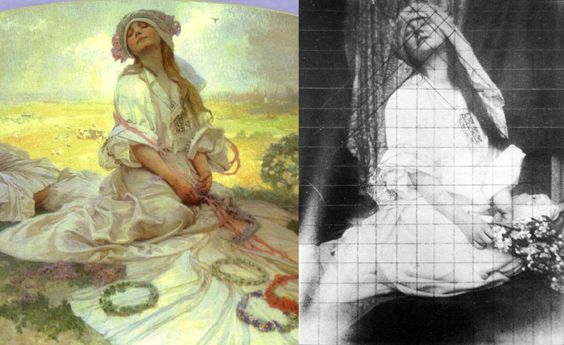 fotos originales de modelos junto a la obra finalizada por Alphonse Mucha
